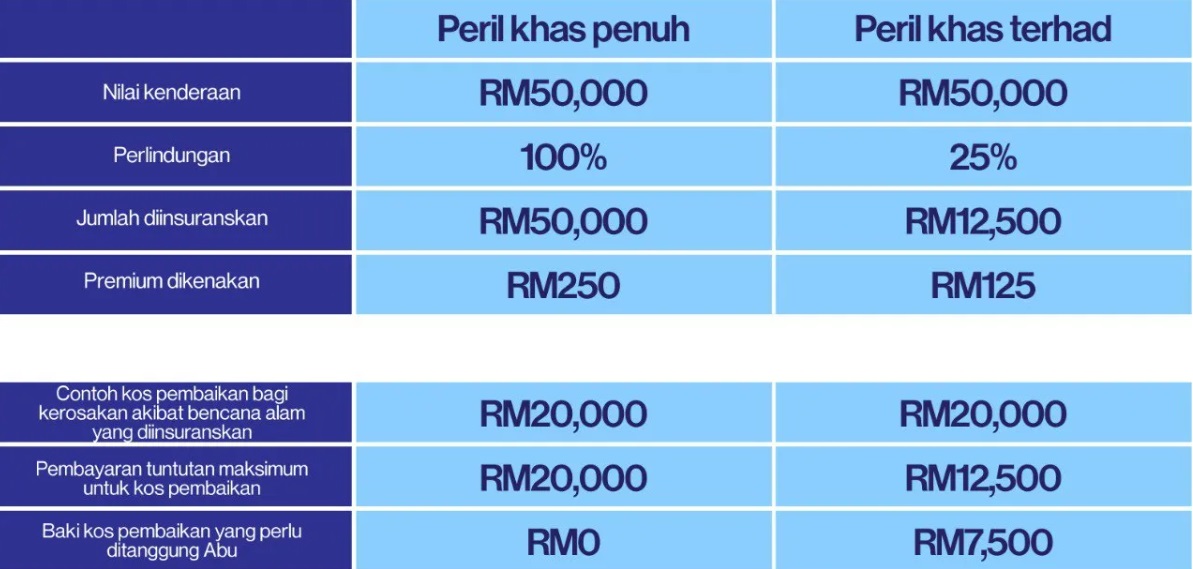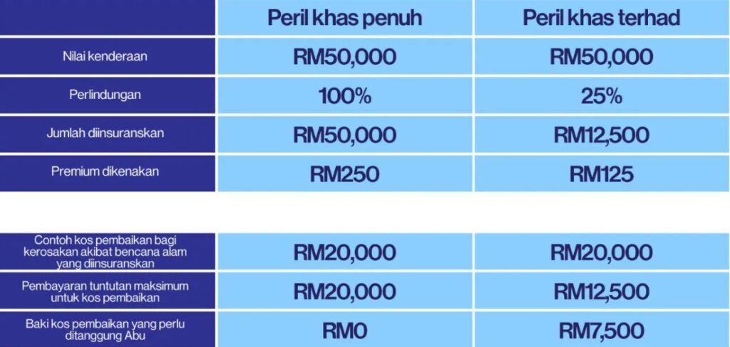 Alu menginsuranskan kenderaannya pada nilai RM50,000. Dia mempunyai pilihan untuk membeli perlindungan tambahan peril khas penuh atau perlindungan peril khas terhad. Jika dia memutuskan untuk membeli perlindungan peril khas terhad, maka dia perlu membayar sebarang kos pembaikan yang lebih tinggi daripada jumlah diinsuranskan bagi peril khas terhad, seperti yang diterangkan dalam jadual di bawah.